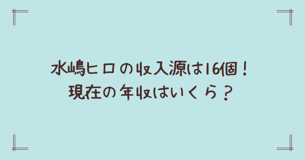 水嶋ヒロさんの収入源が気になる! 水嶋ヒロさんの収入源や年収が気になっている方もいるのではないでしょうか。 水嶋ヒロさんの収入源は16個あると言われていて、現在の年収は1億円~2億円と推測されます。 こちらの記事では水嶋ヒロの収入源16個について... -